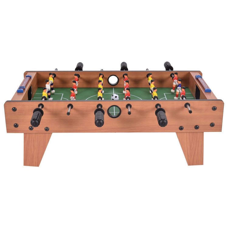 Brand new and high qualityStrong wood construction and solid steel rodMini soccer table you can have soccer fun wherever you go6 rows are included within the table to allow 3 rows per team; 9 red players and 9 yellow playersEquipped with ball serve cups for convenienceInternal ball retrieval at each goalPlastic manual slide scorers at each goalUnified leg panel design with leg spanners on each sideScoring device to count the game process convenientlyTwo footballs included