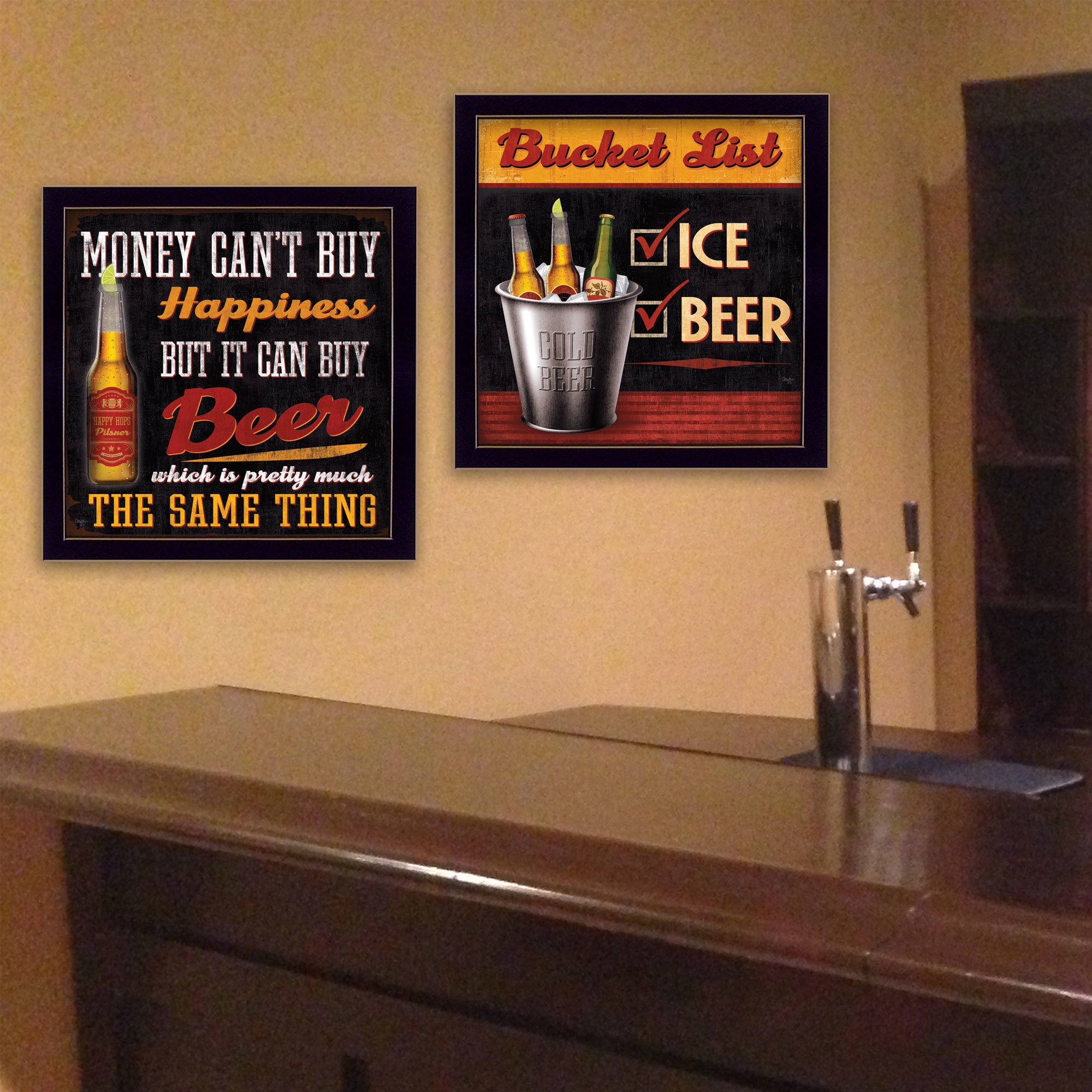 "Bucket List" is 2- 14"x14" framed art print by Mollie B. framed in a decorative black frame. This print will get the laughs in any man-cave. The print has a protective, archival finish (glass is not needed) and arrives ready to hang. Made in the USA with pride by skilled American workers.•Women Owned (WBE)•Textured Artwork with a 'rolled on' acid free acrylic coating to create a canvas painting effect. No glass is necessary.•UV protectant coating protects artwork from fading.•Arrives Ready to Hang