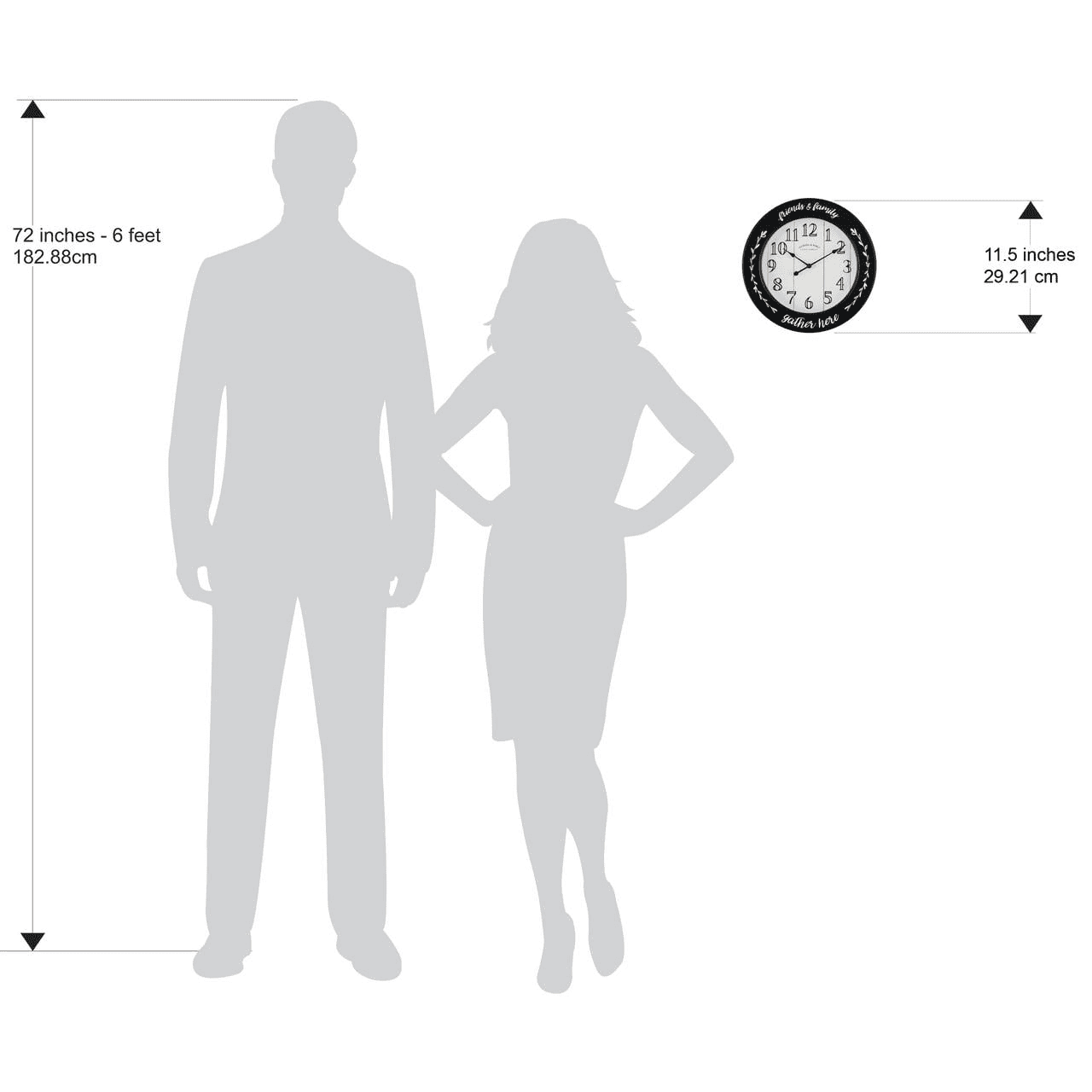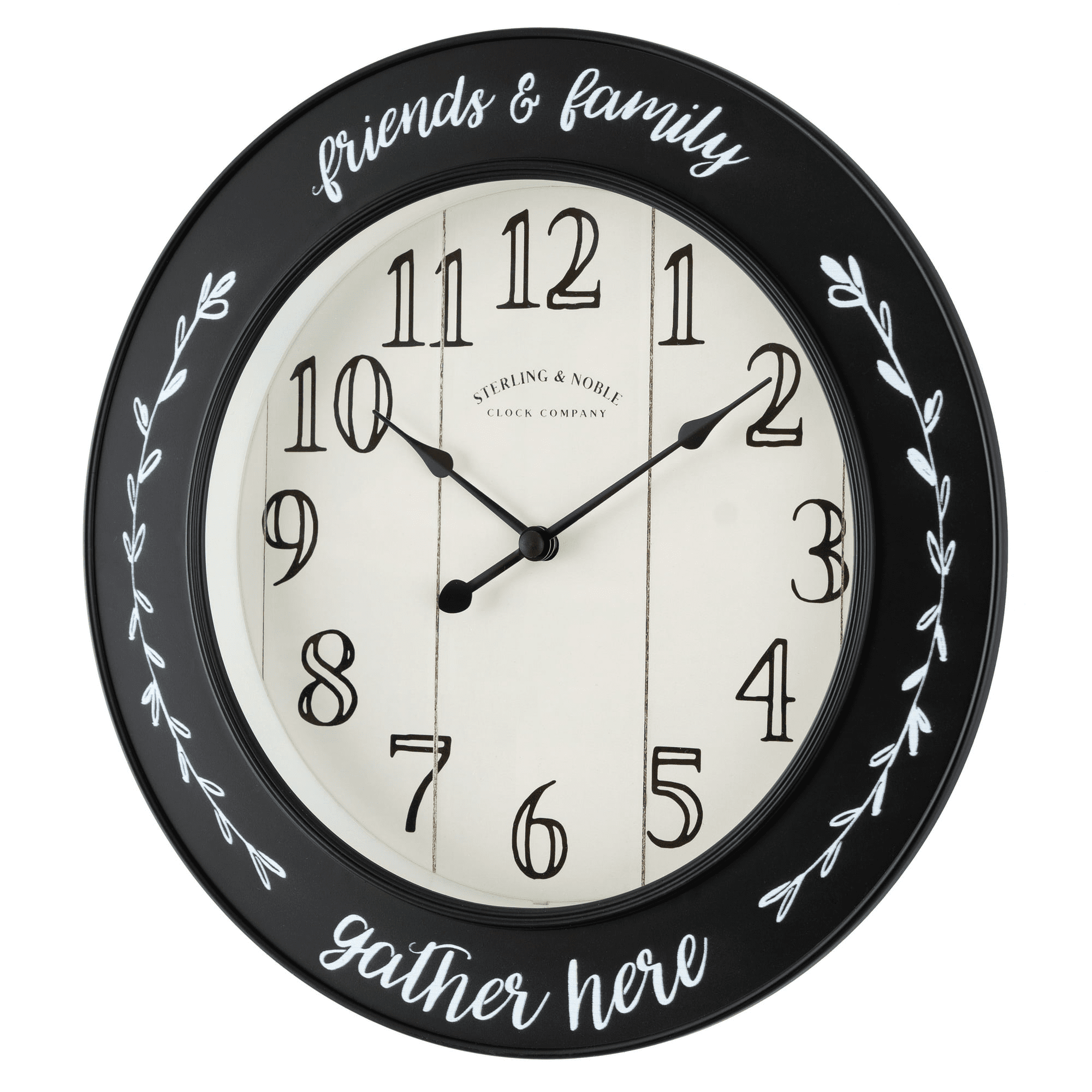 Add warmth and charm to your home with this beautiful mainstays indoor 11.5' black and white 'gather here' shiplap farmhouse expressions wall clock! The clock's frame features a unique profile: a wide plate-like frame with shallow depth gives a floating affect against the wall upon which it is hung. The frame’s satin black finish is contrasted by the white printed artwork featuring hand-illustrated laurel wreath branches on left and right sides, along with a phrase reading 'friends and family gather here' arching at the top and bottom of the frame. A glass lens is secured above the clock’s dial. The dial’s photorealistic vertical white painted wood paneling is completed by the black farmhouse style arabic numerals and genuine sterling & noble clock company insignia arch. Classic teardrop hour and minute hands feature a satin black finish. Quality quartz movement ensures accurate timekeeping. Hang this beautiful clock in your living room among other wall décor, display within your kitchen, spruce up your mudroom or entryway or add some cozy charm to your bedroom or home office!