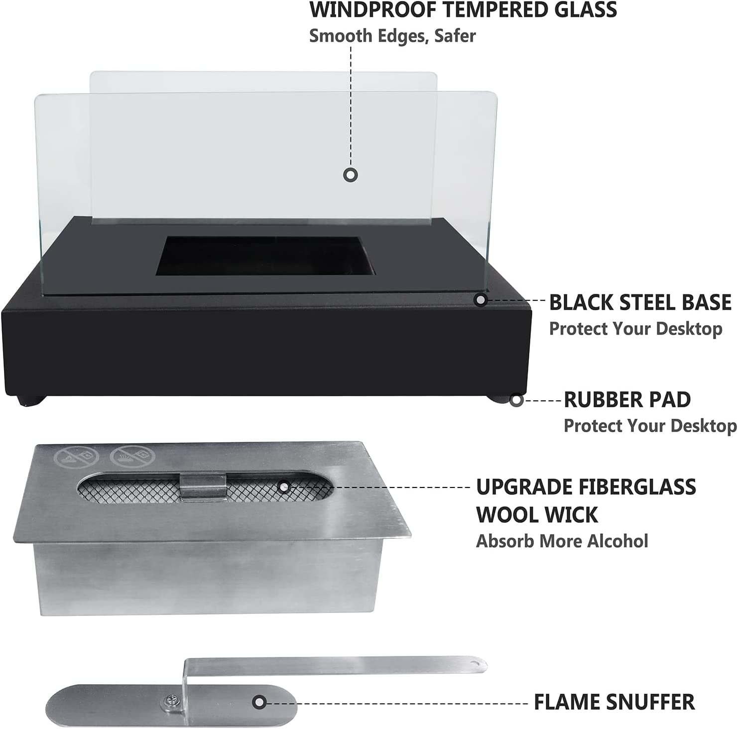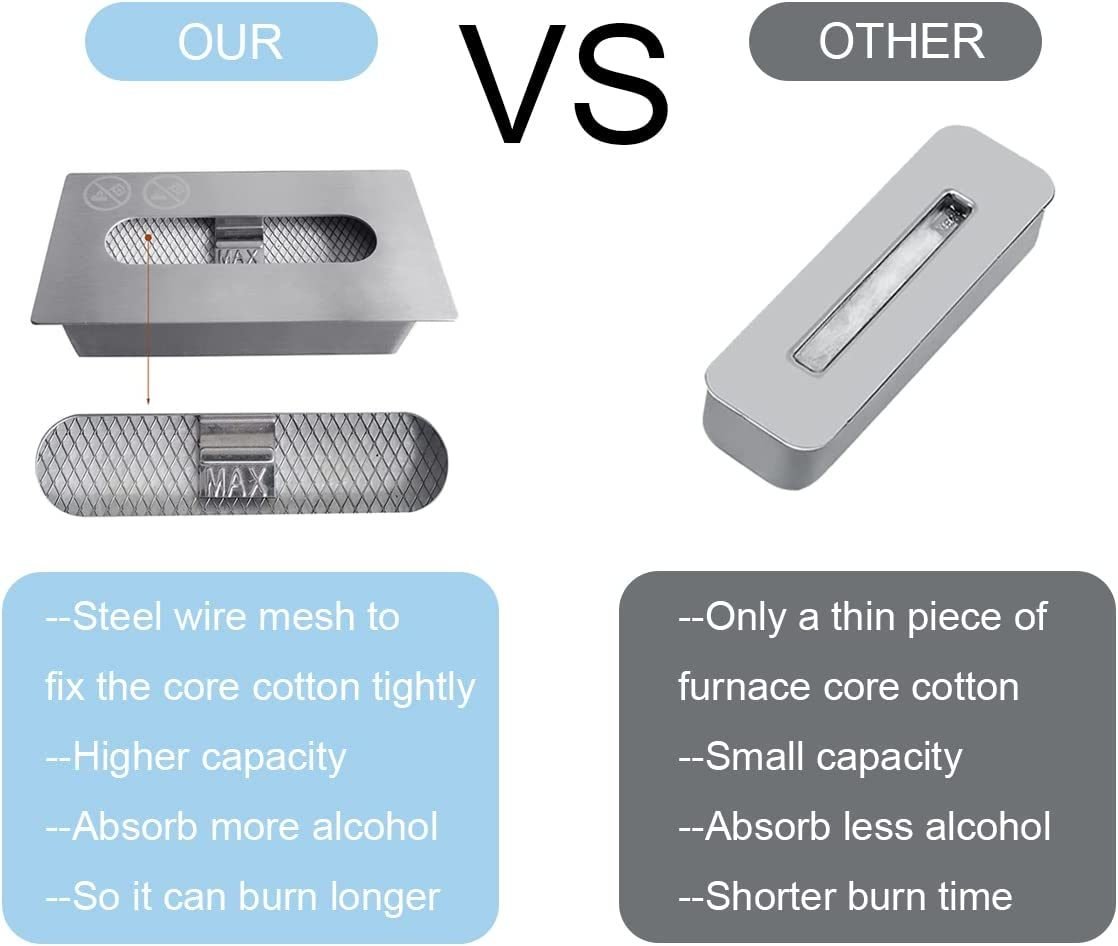 2. Fiberglass wool wick prevent fuel spillage; ensures long-lasting use. Open real flame burns completely ventless; soot free; ash free; easily light and extinguish