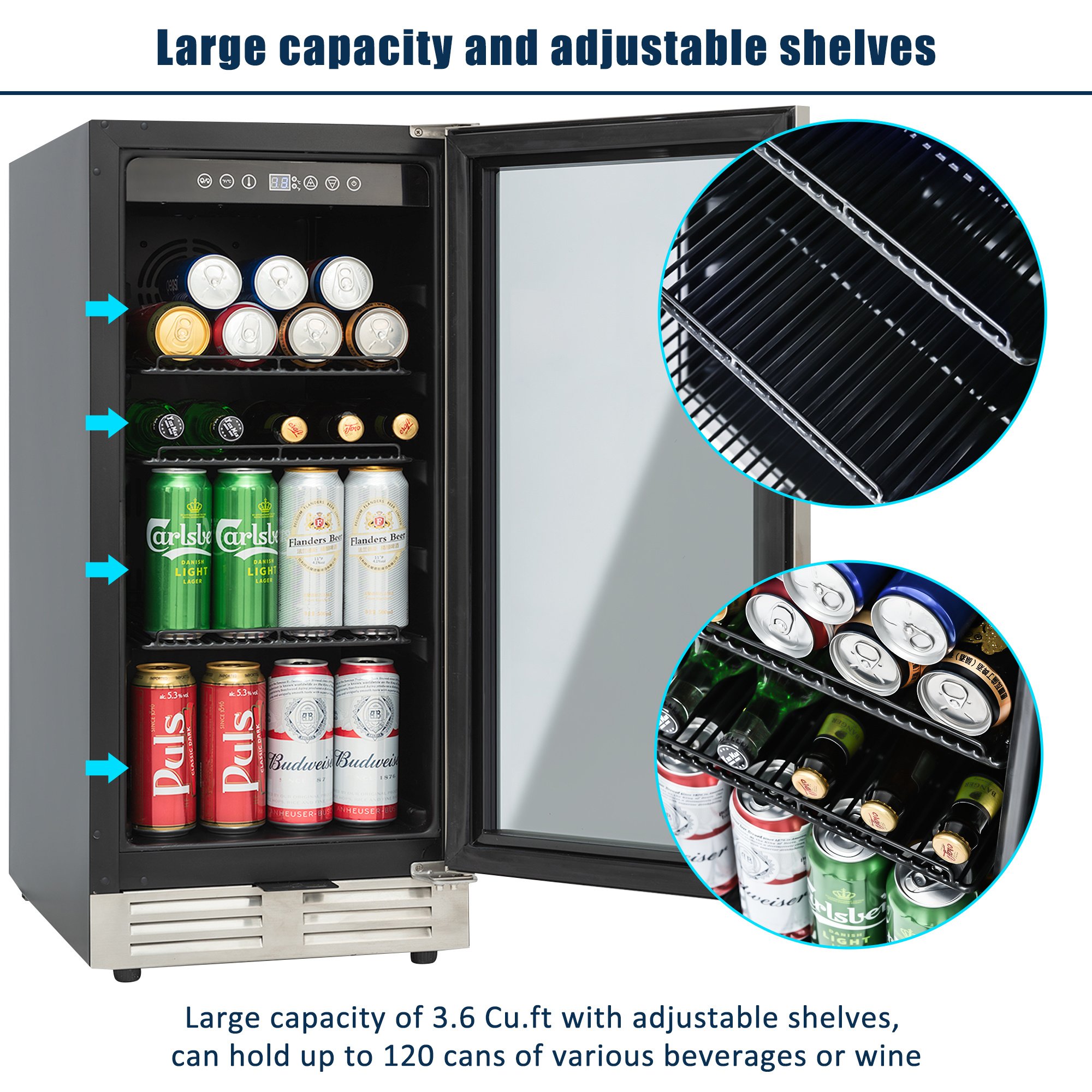 3.Spacious & Customizable: With a 3.6 Cu.ft capacity and three adjustable shelves, it accommodates up to 120 beverages of various sizes. From sparkling water and beer to champagne and wine, all your favorite drinks find a perfect spot.